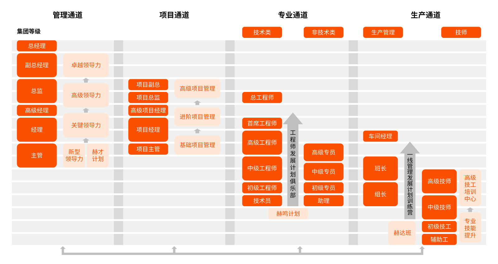 • 員工根據自己的定位、優勢和公司的發展需求,可以在管理、項目、專業、生產等多個通道進行發展,可以充分發揮個人的優勢和價值,取得職業發展的成功